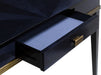 The Kallista Blue Writing Desk has a dark sapphire blue finish that enlivens the sycamore veneers on its top and sides. The wood grains bring the navy blue desk a hint of distressing that contrasts the sleek lines of the door pulls in an antique brass finish and the glossy caviar black finish on the desk's legs.