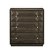 The Kendall Dove Gray Chest has a geometrically striking profile created by the interplay of peaks and valleys on its drawer-fronts. It is made of oak solids and veneers with surfaces in a dove gray finish that have been wire-brushed to accentuate the grain in the wood. The faceted dark brown chest is jewel-like, the metal pulls in a polished brass finish adding a glimmering touch to the warmth of the gem-like chest.