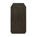The Kendall Dove Gray Credenza has a geometrically striking profile created by the interplay of peaks and valleys on its door-fronts. It is made of oak solids and veneers with surfaces in a dove gray finish that have been wire-brushed to accentuate the grain in the wood. The faceted dark brown credenza is jewel-like, the metal pulls in a polished brass finish adding a glimmering touch to the warmth of the gem-like home-office credenza.