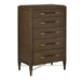 The Verona Chanterelle Five-Drawer Chest is warmly handsome covered in brown lacquered linen with metal detailing in a champagne finish. The stretchers on this brown chest create added interest to enhance its flair. The beautifully detailed drawer pulls, which are wrapped in matching material in the middle and left bare on each end, grace each drawer with their metallic sheen. This is a sophisticated touch, as are the squared edges of the hardware that match the straight-edges on the stretchers. Aimee Kurzner designed the chic chest.