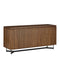 The Indeo Morel Credenza is an intricate piece of furniture. Made of two sizes of solid oak slats that are clad in oak veneers and inset into the frame, the piece is covered in a morel brown finish. A unique design detail is the peek-a-boo illumination that can be seen through the doors when they are open because of the spacing between the ribs of wood. The three-door credenza sits cleverly on iron legs with generously sized stretchers connecting them in a black finish. The cabinet has cord management openings in it for electronics.