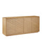 Made of white-oak solids and veneers in a light oak finish, the Margot Natural Oak Credenza was inspired by the casual style of California's coastal communities. A number of outstanding features include a full chamfered profile edge on the face frame, and a multi-dimensional angled pattern on the doors created with white oak crown veneers. There are generous-sized drawers with beige velvet liners, and the drawers are push to open and close.