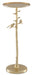 The Piaf Gold Drinks Table is a cast aluminum accent table in a luminous gold finish that will make it gleam from its spot in a room. The whimsical design has two birds perched on twigs extending from a branch-like stem that holds its top.