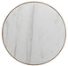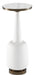 Made of composite in a gesso white finish, the Greta White Drinks Table has a pedestal that expands before it gathers itself to meet the metal base. The tabletop surround matches the contrasting tone of the base, both in an antique brass finish. The white drinks table is set with a Volakas marble top.