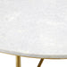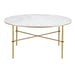 The Kira Marble Cocktail Table is a classically designed gold and white coffee table with modern lines thanks to the tapering of the legs at top and bottom and the clean-lined stretchers. Made of iron in an antique brass finish, the gold cocktail table is topped with a disc of white marble that ups the ante on its sophistication. Introducing an enhanced sense of refinement are the circlet details where the stretchers clasp each of the four legs.