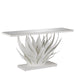 The Agave White Console Table was inspired by the flourishing plant of the same name, whose spiky, leathery fronds curl up from the ground just as the oversized leaves on this white console table do. "My love of the Agave plant, of which hundreds of varieties flourish in the Yucatan, has inspired me for many years," says the table's designer Marjorie Skouras. Her passion for the Yucatan peninsula, the surroundings in which she lives and through which she translates the flora and fauna into dynamic products in her studio, shines in this wrought iron table covered in a crisp gesso white finish with a mirrored top.