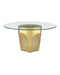 The Lemy Brass Cocktail Table is a mix master of shapes and textures. Made of stainless steel in a polished brass finish, the gold cocktail table has textural indentions that look as if they have been carved out of the metal. The contemporary piece is topped with a tempered glass top.