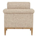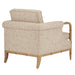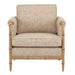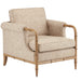 The frame of the Merle Walnut Armchair is made of beechwood in a weathered walnut finish. The bamboo-inspired chair has loose box cushions covered in a Finn Safari upholstery fabric that can be flipped, which is recommended from time to time. Design details of note are the fully upholstered seat deck and latch clips on the top that hold the back cushion in place. By wrapping the arms and back in upholstery, the chair is very comfortable for the human form. Barry Goralnick says of this design, "Faux bamboo has been popular for centuries, from Louis XVI to Billy Baldwin, the element has been found in many lavish designs."