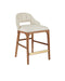 The Inga Counter Stool, covered in Endurance Sand fabric, has an upholstered back and seat that sits nimbly atop a solid white-oak frame in a morel brown finish. The paleness of the fabric and the warmth of the wood are contrasting elements. A brass kick plate on the front rung in a brushed brass finish serves a purpose and brings a bit of brightness to the design by Aimee Kurzner.