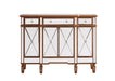 This fashionable, contemporary Mirrored console, with its hand-rubbed gold  finish and incised carved, tapered legs, features a slight antique touch. Its 3 Mirrored drawers and 4 Mirrored door fronts are enhanced with brushed steel knobs. Measuring L48" x W14" x H36", its alluring symmetry, size and shape make this piece perfect to magnify the beauty of your living room or add a touch of elegant decor to a hallway or narrow space. In addition, this attractive Mirrored cabinet offers you extra storage space and a wide display area for your art objects, figurines or candle holders. (Constructed with selected kiln-dried solid wood and engineered wood panels.)