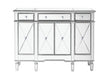 This fashionable, contemporary Mirrored console, with its hand-rubbed silver finish and incised carved, tapered legs, features a slight antique touch. Its 3 Mirrored drawers and 4 Mirrored door fronts are enhanced with brushed steel knobs. Measuring L48" x W14" x H36", its alluring symmetry, size and shape make this piece perfect to magnify the beauty of your living room or add a touch of elegant decor to a hallway or narrow space. In addition, this attractive Mirrored cabinet offers you extra storage space and a wide display area for your art objects, figurines or candle holders. (Constructed with selected kiln-dried solid wood and engineered wood panels.)