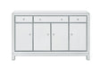 In bold symmetry,  measuring W56xD13xH36", this contemporary piece can decorate any narrow hallway or dinning room and still yield plenty of storage space. With the gleaming beveled mirror surfaces, it opens up the visual space in the room while imbuing it with glamour. The crystal door knobs exude sheer elegance. FEATURES: Reflexion collection  3 drawers and 4 doors crystal knobs Hand paintedSilver finish  Beveled mirror panel Solid wood trim and legs  Wood drawer glides  Inside lining painted in silver.   PRODUCT DETAILS: Measurement W56xD13xH36" No assembly required Material in solid wood and engineered wood 1 year limited warranty.