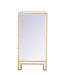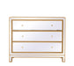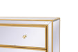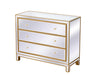 Striking a balance between elegance and functionality, this 40" wide cabinet is likely to be a perfect choice. It has three drawers with generous storage space, glamorous mirror surfaces, and stylish mitered corners. This contemporary chest with drawers is a perfect storage complement whether in your bedroom or any other room in your home.  FEATURES: Reflexion collection  3 large drawers   crystal knobs Hand painted gold finish  Beveled mirror panel Solid wood trim and legs  Wood drawer glides  Inside lining painted in gold.   PRODUCT DETAILS: Measurement W40xD16xH32" No assembly required Material in solid wood and engineered wood 1 year limited warranty.