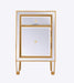 Add a touch of class to your bedroom or any room with this stunning accent chest. With beaming mirrored surfaces, it opens up the visual space in the room while imbuing it with glamour. This functional contemporary chest comes with one drawer, one door,  sparkling crystal knob, and gracefully tapered legs.  FEATURES: Reflexion collection  1 drawer  and 1 door crystal knobs Hand painted gold finish  Beveled mirror panel Solid wood trim and legs  Wood drawer glides  Inside lining painted in gold.  PRODUCT DETAILS: Measurement W18xD13xH29" No assembly required Material in solid wood and engineered wood 1 year limited warranty.