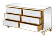 Sophisticated with a reflective touch, this 60" wide contemporary cabinet adds style and functionality to your home. Six deep drawers provide ample storage space, each decorated with a square brushed steel knob. Distinctively designed with mitered corners, all surfaces are inlaid with mirror panels. Â This contemporary cabinet enhances the brightness and ambience in your room. Â FEATURES: Reflexion collection 6 drawers Brushed steel drawer knobs Hand brushed gold Beveled mirror panel Solid wood frame and legs Wood drawer glides drawer lining painted in gold. Â PRODUCT DETAILS: Measurement W60xD18xH32" No assembly required Material in solid wood and engineered wood 1 year limited product warranty.