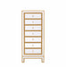 Enhance your bedroom or dressing area with this elegant and sophisticated lingerie chest, pamper yourself! You can also store your treasured belongings or goldware in this petite 7 drawer chest in any corner of your room. Dramatic and sophisticated, it has a hand painted gold finish border, beveled mirror panels on all surfaces, sparkling crystal drawer knobs, and mitered corners. FEATURES: Reflexion collection  7 drawer crystal knobs Hand painted gold finish  Beveled mirror panel Solid wood trim and legs  Wood drawer glides  Inside lining painted in gold.  PRODUCT DETAILS: Measurement W18xD15xH42" No assembly required Material in solid wood and engineered wood 1 year limited warranty.