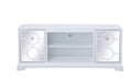 Sleek and vibrant, this transitional media cabinet will make a striking statement in any room can showcase up to a 60" flat screen TV at a perfect height. Featuring top-quality mirror panel with circle overlay and hand-painted in a semi-gloss white finish, accentuated with crystal square knobs. Functional and chic, it features 2 side doors, center opening with shelvings that provide plenty of storage for your equipment, games, and books.