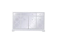 In bold elegance, measuring W60xD14xH36", this transitional beauty can decorate any narrow hallway or dining room or living room and still yield plenty of storage space. With the gleaming beveled mirror surfaces and white body, it opens up the visual space in the room while imbuing it with glamour. The crystal door knobs exude sheer elegance. Features 3 drawers and 4 doors in an infinity circle overlay design.