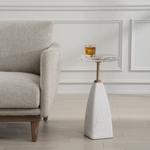 This Accent Table Showcases A White Faux Shagreen Leather Wrapped Body, Offering A Soft, Textured Appeal With Brass Plated Steel Bands That Rise Al...
