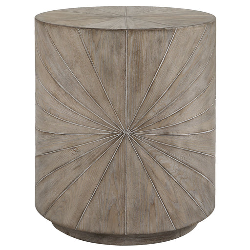 Crafted From Fir Wood Veneer, The Starshine Side Table Features A Starburst Motif Surround Finished In Warm Gray Stain With Light Cerusing That Acc...