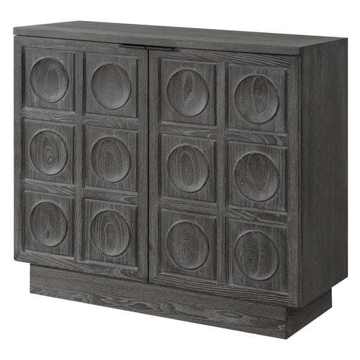 A Two Door Cabinet Featuring A Striking Carved Circular Design, Constructed From Solid Elm And Elm Veneer. The Rich Ebony Stain Highlights The Dram...