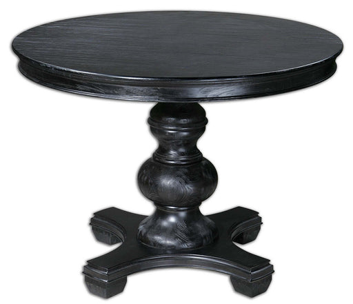 An Elegant Entryway Table Or Small Dining Table, Featuring Detailed Moldings And A Stylish Turned Baluster In A Satin Black Finish With Subtle Pine...