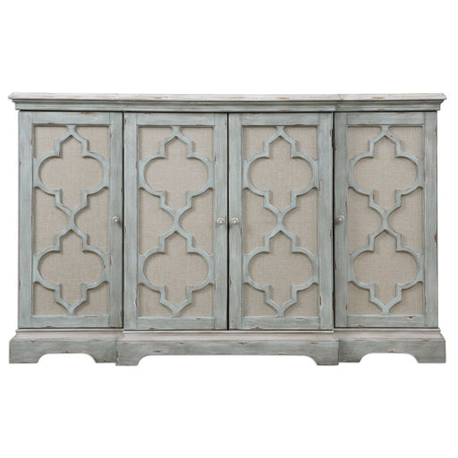 Breakfront Console In Weathered Sea Gray With Ivory Accents. Open-carved Doors Are Backed In Light Tan Linen, Enclosing Three Adjustable Shelves.De...