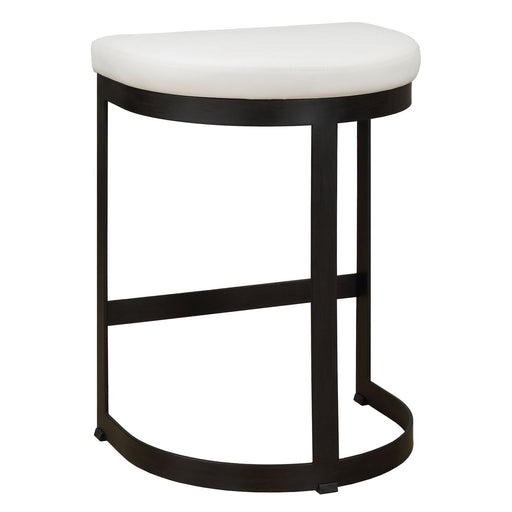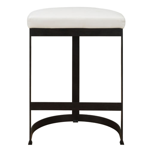 Simplistic But Sturdy, This Statement Counter Stool Features A Thick Hand Forged Iron Base Finished In Matte Black. Plush Seat Is Tailored In A Whi...