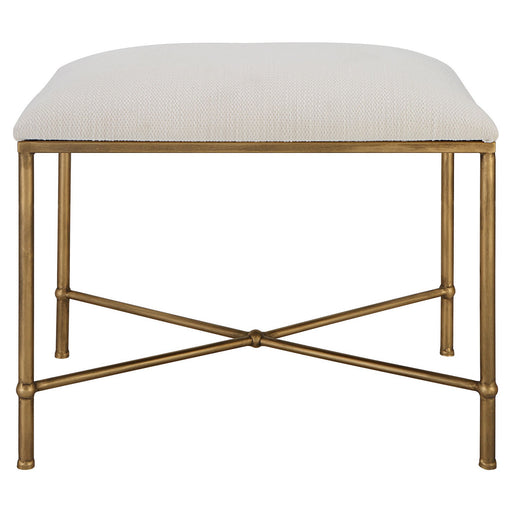 Classic And Sophisticated, This Accent Bench Features A Geometric Iron Base In Antique Gold Leaf With An Upholstered Seat In A Crisp White Textured...