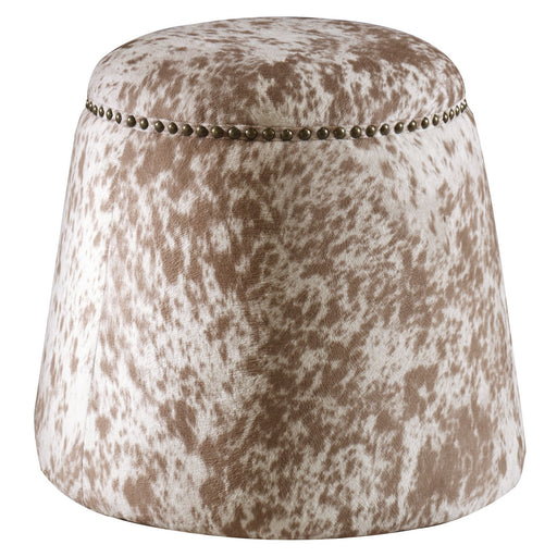 This Plush Ottoman Is Covered In A Soft Chestnut And White Faux Cow Hide With Antique Brass Nail Head Details. Versatile And Stylish, This Piece Ca...