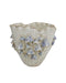 The Black Forest Mushrooms Small Ivory Vase is a vessel onto which fanciful mushrooms in a blue reactive glaze have been affixed. The expressive nature of the fungi makes this ivory vase whimsical and interesting. Made of ceramic by a group of women who live at the border of Burma and Thailand, the incredible hand-thrown vase is composed and then the decorative elements are put place, one-by-one, by hand.