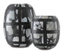 The Schiappa Glass Vases, which come in a set of two, are made of mouth-blown glass with a black surface onto which a mottled layer of multicolor glass has been added as it was being blown. To create an additional layer of artistry, a thick adhesive tape has been applied in a crisscross pattern that is sand blasted to remove the multicolor layer and reveal a black grid-like overlay.