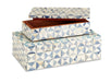 The Sky Blue Box Set illustrates the talents of the artisans who create the surfaces of these white decorative boxes. The mosaics in white and blue bone are painstakingly arranged and affixed to the wood boxes. The patterns achieved by the triangular shaped segments bring this white decorative box a textural feel while the patina washed on top gives it an aged appeal.