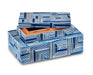 With bold patterns that match on all sides, the Cade Blue Box Set includes two nesting boxes that are made of solid wood covered in composite in blue and white patterns. The intermingling of thin and thick delineations creates a telescoping effect that brings the surfaces of these boxes the feel that they are in constant movement. The application is a painstaking one.