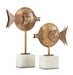 Handmade from brass to look like found objects unearthed in an exotic bazaar, the Cici Brass Fish Set includes one tall and one short fish in antique brass finishes. The artful creations extend from white marble bases that contrast the warmth of the brass fish sculptures.