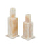 The Lithos Ivory Candle Holder Set includes two candle holders made of a cream onyx. The geometric shapes that compose its profile are enlivened by the natural veining of the stone, making each one unique. The characteristics of this stone bring a warm peachy and cool ivory interplay to their surfaces.