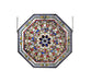 A magnificent octagon shaped stained glass window features various symmetric design repeats that branch out from a Cobalt and Clear Beveled glass eight-petaled flower in the central medallion. Victorian styled floral motifs with Red Roses blossom from natural Green and Golden stems among fanciful Beige scrollwork on backgrounds of Cobalt, Clear Iridescent and Clear Ripple glass. The design is trimmed with tilework borders in Dusty Rose, Leafy Greens and Rosy Reds and Cobalt on a Clear Ripple and Clear Iridescent glass trim with Lavender and Red jewels. The window features an Antique Brassfinished frame and includes hanging chains.