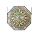 A magnificent octagon shaped stained glass window features various symmetric design repeats that branch out from a Light Green and Clear Beveled glass eight-petaled flower in the central medallion. Victorian styled floral motifs with Roses that blossom from natural Green, Beige and Gold Stems among fanciful scrollwork on a Clear Ripple and Iridescent glass background. The window is trimmed with tilework borders in Scarlet Rose, Leafy Greens and Rosy Reds on a Clear Ripple and Iridescent glass trim. The window features an Antique Bronze finished frame and includes hanging chains.
