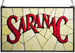 A custom crafted window featuring the popular Saranac logo of the popular craft beer brand that is brewed in Utica, New York. The Red Saranac logo is featured on a Wispy Golden Ale colored background with a gentle texture of shallow river rapids. The window was created using Meyda Tiffany's famous copperfoil construction process. The frame is finished in Black and hanging chains are included. Meyda offers complete custom capabilities to create stained glass windows or lighting featuring any design, company name or logo.