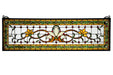 Herald in a touch of class to your home with this stylized floral stained glass window that features beautiful vivid colors in a simplistic design. At the focal point of this window is a Bone Beige flower flanked by Saffron flowers on each side. Mahogany stems and green leaves wed the floral design on a clear back ground accented with red jewels. A Green chain link design accented with Beige diamonds and Red jewels is surrounded by saffron to complete the design. This stunning window is created using the famous Meyda Tiffany copper foil construction process and attached to a Black frame. This transom window can be used above a door or placed as a pair on both sides of a door, especially in entryways. Brackets and hanging chains are included.