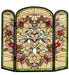 This charming Meyda Tiffany original stained glass firescreen depicts a heart shaped ring of Merlot and Pink roses, Daisy and Violet blossoms, and Willow Green leaves that surround ribbons and scrolls against an Ivory background. The brass frame has a dark hand applied patina. Use this piece of art as an off season fireplace cover or an elegant accent piece in any corner of your home.
