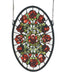 Burgundy roses with Willow Green leaves radiate around a single rose against a Crystalline sky in the resplendent oval shaped window. Handcrafted with stained art glass utilizing the copperfoil construction process, this beautiful window also comes with a solid brass hanging chain and brackets.
