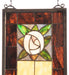 Sparkling Deep Brown Rootbeer glass frames surround and Arts and Crafts inspired Plum colored rose with Cottage Green leaves and accents and Cornerstone Beige background. The rectangular Meyda Tiffany original stained glass window is framed in solid brass and has brass mounting bracket and chains included