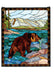 In the sparkling Turquoise river winding through Granite Grey mountains with a stand of Pine Green trees, is a Brown bear with his catch of the day. This picturesque scene is handcrafted of a beautiful selection of stained art glass. The Meyda Tiffany Original window is framed in a rustic Bark and Leather Brown diamond border. Brass mounting bracket and chains are included.