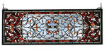 A Pomegranate Red border is centered over a Frosty Blue field with flowers and flourishes of Wispy White and Amber jewels. This Meyda Tiffany classic transom window is created of 512 hand cut pieces of stained art glass. The solid frame is made of the same brass as the hanging bracket and chains that are included with this window.