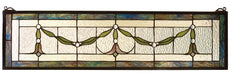 A Multi Hued border and garland borders accent the rippling textured Clear glass of this elegant Victorian inspired stained glass window. The window is handcrafted utilizing the copperfoil construction process and 86 pieces of stained art glass encased in a solid brass frame. Mounting bracket and chain are included.