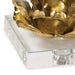 Boasting gold blossom-like accents, this piece is a forward-thinking work of art. Placed on top of a crystal base completes the glamorous look. For added elegance, a single tapered candle can be inserted into the center of the flower to illuminate your space.