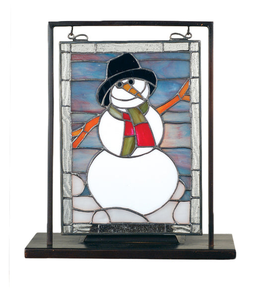 A Winter White snowman dressed in Black top hat and Red and Green striped scarf is ready to warm your home. Made of 79 pieces of hand cut stained g...