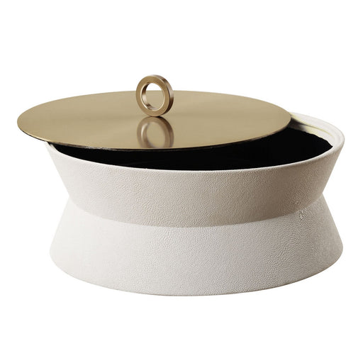 Luxe Round Box, A Stunning Blend Of Sophistication And Style, Is Wrapped In Pristine White Faux Shagreen. The Lift-off Plated Brushed Brass Lid Add...