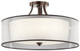 The Lacey 28" 5 light semi flush features a classic look with its Venetian detail of curves in Mission Bronze finish and satin etched cased opal inner diffusers and light umber translucent organza outer shade. The Lacey semi flush is perfect in several aesthetic environments, including transitional and traditional.